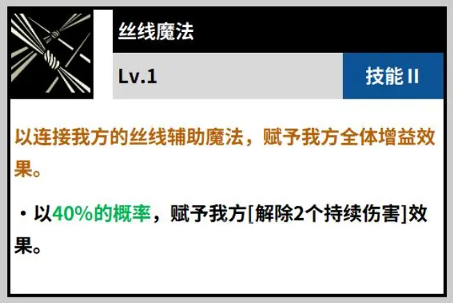 第二个技能“丝线魔法”拥有较长的冷却时间,需等待三个回合才能再次施放。此技能能够激活全场丝线连接效果,为我方全体成员提供防御力提升的增益,持续两个回合。此外,该技能有40%的概率触发驱散机制,清除两名队友身上的两个持续伤害类负面状态。面对控制频繁或DOT(持续伤害)较多的敌人阵容时,这一技能具有极高的战略价值。同时,凡妮莎自身也会获得相当于140%数值的属性加成,进一步强化其战场续航。