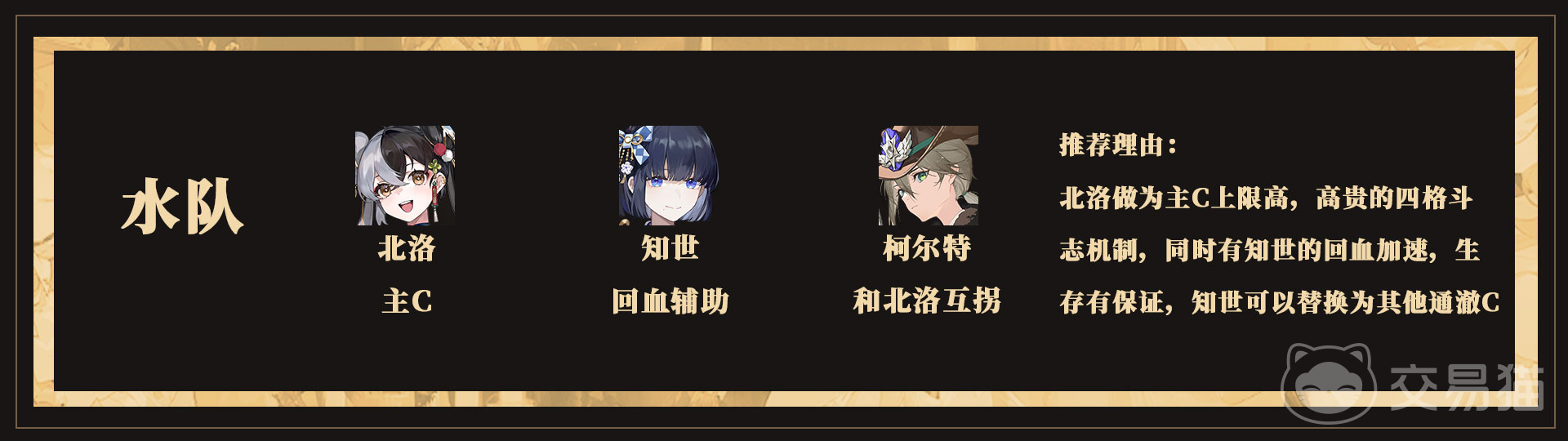 基于上述机制,推荐一套以北洛为核心的水系输出组合,搭配知世与柯尔特。北洛作为主C拥有极高的爆发潜力和四格斗机制,知世可在北洛受到伤害时迅速提供治疗,有效提升续航能力,而柯尔特则与其形成双向连携,进一步强化输出循环。