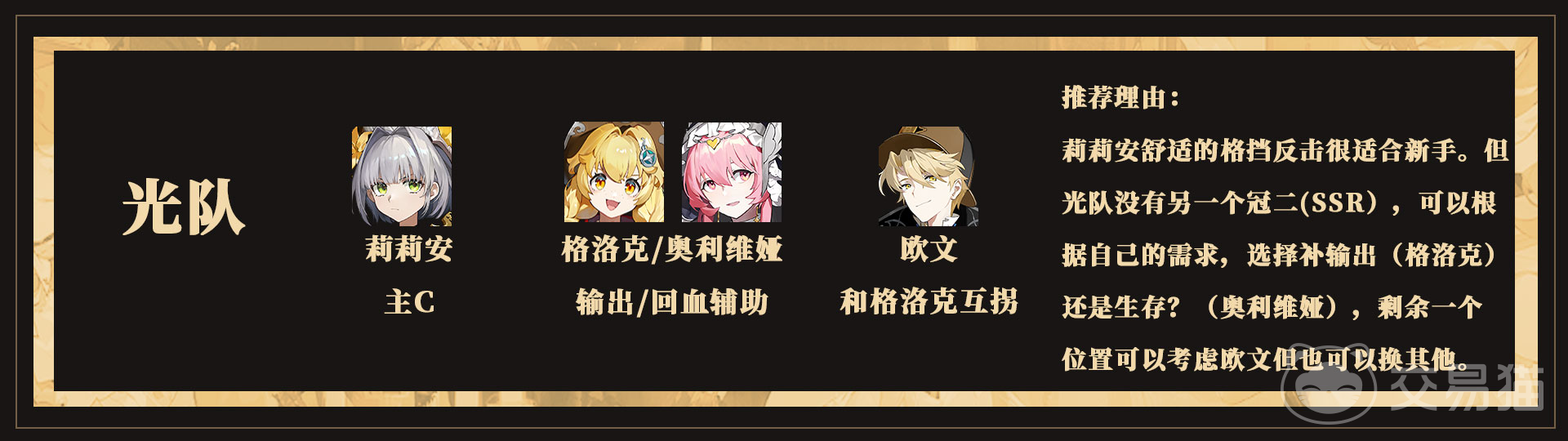 另一套值得尝试的阵容是以莉莉安为主输出,配合格洛克与欧文组成的光属性队伍。莉莉安具备格挡反击类被动技能,适合新手操作;格洛克则可承担补充输出职责,弥补莉莉安在持续输出方面的短板,使整体战斗节奏更加稳定。