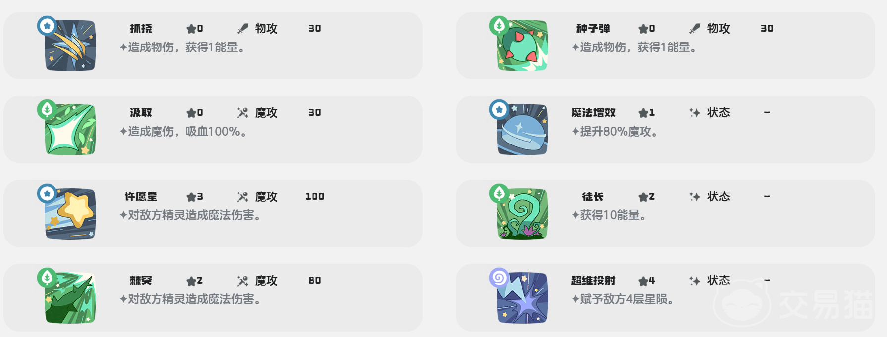 魔草巫灵融合了草系与幻系双重属性,这种稀有的属性组合赋予了它在战场上灵活多变的战术定位。其核心输出技能“许愿星”具备高达100的威力值,能够对敌方目标发起强力冲击,每次释放都能造成显著伤害,并带有强烈的压制效果。此外,该技能在命中后往往能为战局带来转折,是扭转劣势的关键手段之一。另一个物理攻击技能“刺突”,则模拟出隐藏尖刺突袭的效果,适合用于针对防御较弱的目标,实现快速点杀。