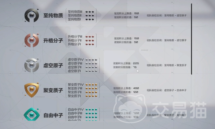 该游戏共设有九个主要段位,从初始阶段逐步迈向巅峰。新手玩家初始段位为至纯物质,随后可依次晋升为升格分子、虚空原子,这三个层级属于入门级别。想要脱离初级阶段,需在排位赛中赢得至少四场胜利,积累足够的星星以完成晋级。当达到虚空原子后,将进入进阶段位:聚变质子。该大段位包含五个子等级,分别为聚变质子、自由中子、束缚电子和禁闭夸克,每个小段位均需获得五颗星才能顺利升级。