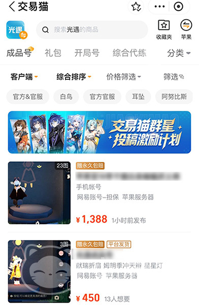 光遇作为美好治愈风游戏,它画风独特,又采用了赛季制模式,每隔两个月左右进线一次大更新。游戏新颖,吸引不少玩家买号体验。下面小编分享一下渠道服光遇游戏账号如何购买。游戏交易平台有不少,交易猫是其中较早上线的,它拥有很高的知名度和完善的担保交易机制,快速累计了千万用户。平台每天交易量十分火爆,买卖双方身份都通过了专门认证。