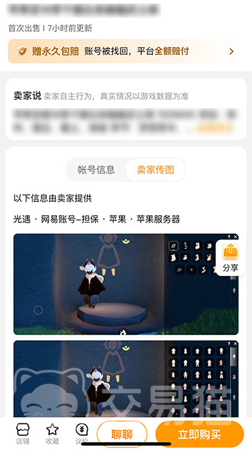 以上就是渠道服光遇账户购买平台推荐,交易猫作为较早发布的专业游戏平台,它最大优势是服务好,售后有保障。玩家不必担心买号被骗,平台售后期限超长,玩家保存好交易信息证据截图,提交给客服之后,快速获得保险赔付。