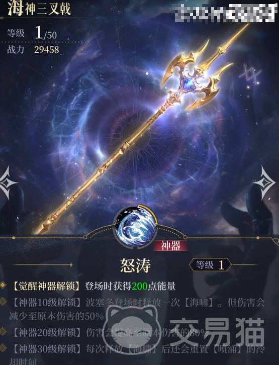 若为其配备专属神器“海王三叉戟”,可激活觉醒能力并获得“怒涛”特效:每次登场时自动回复200能量,显著加快大招释放频率。当神器升至10级时,登场即可立即释放一次海啸攻击,虽然此时技能伤害降至原本的50%,但战略价值极高。