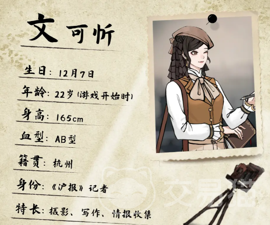 文可忻出生于12月7日,身高165厘米,血型为AB型,籍贯杭州。游戏初始时年仅22岁,任职于上海的一家报社。她擅长摄影、写作以及信息搜集,在汉阳铁厂案中首次与主角相遇,并自此展开了一系列独立调查。每一次出场,她都能挖掘出对破案至关重要的线索,成为主角破案过程中值得信赖的伙伴。