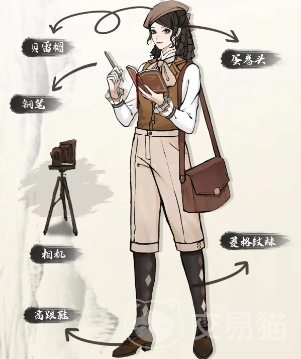 在造型设计上,文可忻常佩戴贝雷帽,留着优雅的蛋卷头发型,脚穿菱格纹袜搭配高跟鞋,整体风格复古而精致。她随身携带一支可自由流动墨水的钢笔,用于随时记录见闻;同时配备一台柯达布朗尼相机,便于现场拍摄取证,其便捷的操作和低廉的成本非常适合当时的时代背景。