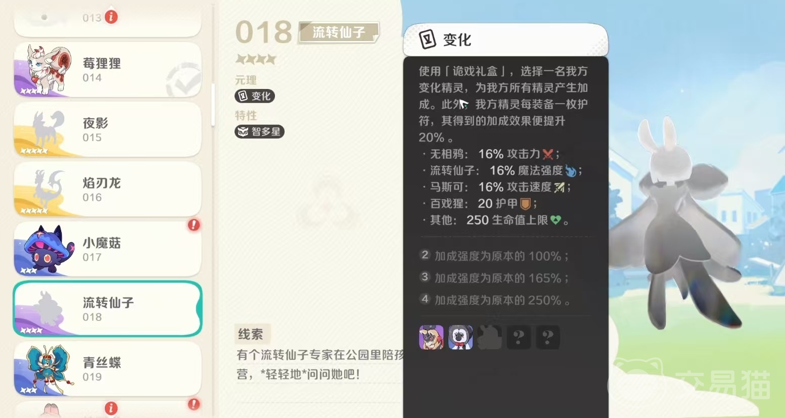 “变化”元理的核心机制依赖于诡计礼盒的使用,当玩家选择一名我方具有变化属性的精灵后,可为全体精灵提供增益效果。此外,每装备一枚护符(即通过心像系统获得的附加属性),该增益效果将额外提升20%。目前具备变化元理的精灵包括无相鸦、流转仙子、马斯可和百戏猩。其中,无相鸦提供16%攻击力加成,流转仙子赋予16%魔法强度加成,马斯可增加16%攻击速度,百戏猩则带来20点护甲值。若同时上阵这四位精灵,即可触发四重羁绊,使整体加成效果提升至基础值的250%,不仅成型简单,且个体强度优秀,非常适合组建以变化为核心的阵容体系。
