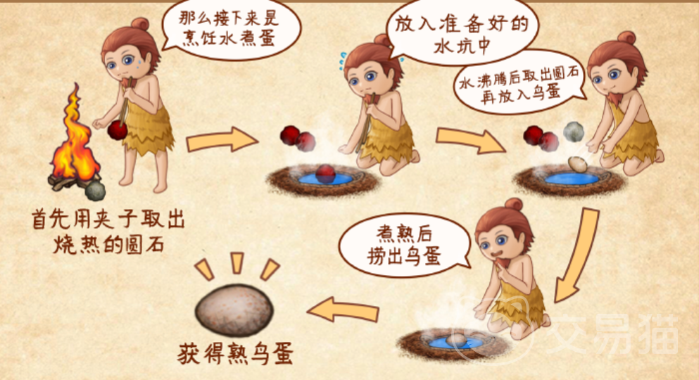 鸟蛋作为高营养的食物之一,只需煮熟便可享用。具体操作方法为:先将几块石头投入火堆中烧至高温,然后用夹具取出并迅速放入盛有清水的坑洼处,使水温上升直至沸腾。接着移除热石,直接将新鲜鸟蛋放入热水中焖煮几分钟,即可完成一道简单的煮鸟蛋料理。
