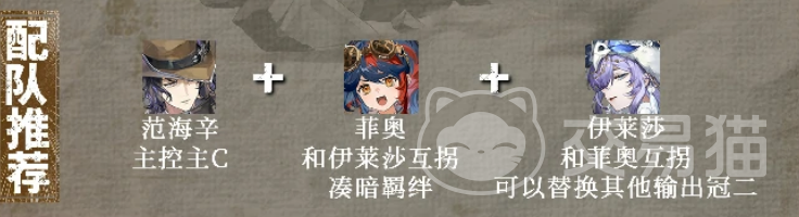 范海辛除了拥有高频率的远程攻击手段外,在站桩输出方面也表现优异。他的技能机制决定了其可以很好地与同属枪械系的输出型角色协同作战。推荐将其与菲奥、伊莱莎组成三人小队。在这个组合中,范海辛主要担任主力C位,负责关键伤害输出和战场压制;而菲奥与伊莱莎之间可根据实际情况灵活替换,二者均属于暗属性角色,能够激活“暗系”专属羁绊,进一步提升整体战力。