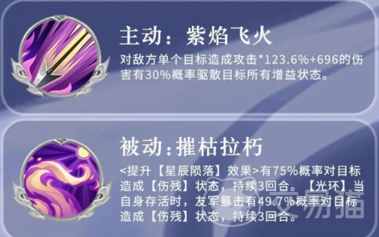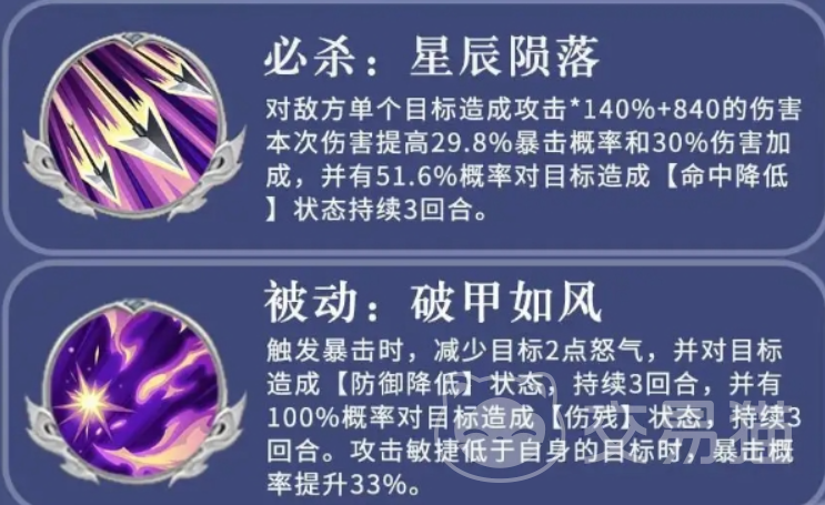 其主动技能“星辰陨落”可对单一目标造成大量伤害,并随暴击率与伤害加成进一步提升输出上限。一旦命中,有50%几率使目标命中率下降,持续三个回合,大幅削弱敌方输出稳定性。同时,他的被动技能表现极为亮眼:每次暴击成功后,可减少目标2点怒气值,有效延缓对手大招释放节奏。后期该技能还会附加防御降低效果,同样持续三回合,并且以100%概率施加残伤状态,限制敌人恢复能力。
