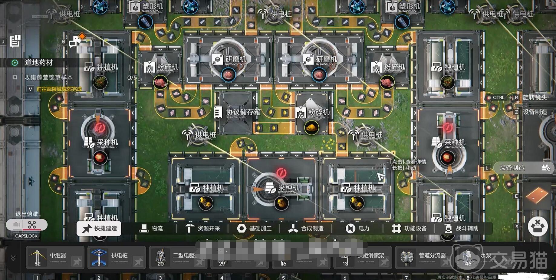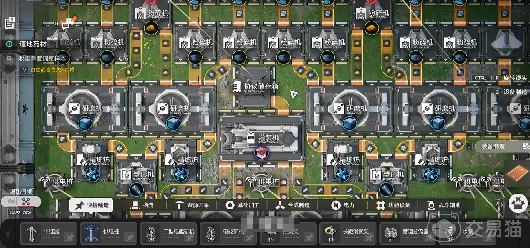 工厂系统主要由协议核心、生产线模块和电力网络三大结构组成。协议核心作为整个厂区的中枢,决定了设备可建造范围(黄色区域为供电覆盖区),在此范围内可部署精炼炉、粉碎机等关键装置。游戏初期,在蓝图解锁后建议优先搭建两条基础产线:第一条为紫金矿→精炼炉→塑型机→灌装机,用于零件生产;第二条为种植机→粉碎机→罐装机,专注于药品制造。关于传送带系统,虽然后期较为复杂,但入门阶段只需掌握基本树状分布原则即可——主干负责原材料输送,分支逐步承接后续工序,且主线带宽应大于支线以防止拥堵。特别提醒:当精炼炉输出端连接3条传送带时,每条效率会下降至33%,因此重要物资建议独立布线。