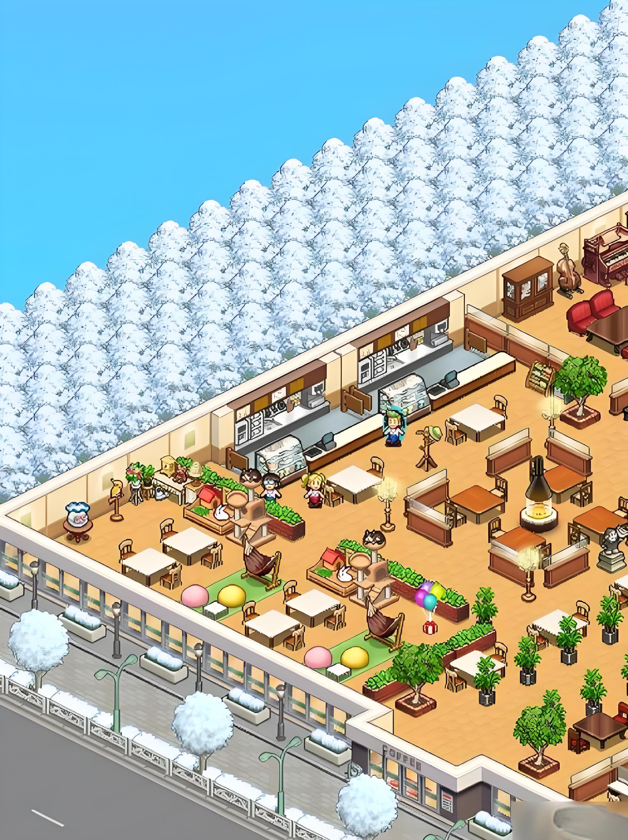装饰物不仅影响视觉效果,还具备实际增益功能。例如,在顾客餐桌旁放置盆栽有助于提升其心情值;在出餐区挂上艺术画作,能够加快员工制作饮品的速度;将特殊装置设于收银台周围,可提高单笔订单的收益;而在露天阳台配置遮阳伞,则能显著增强顾客满意度。