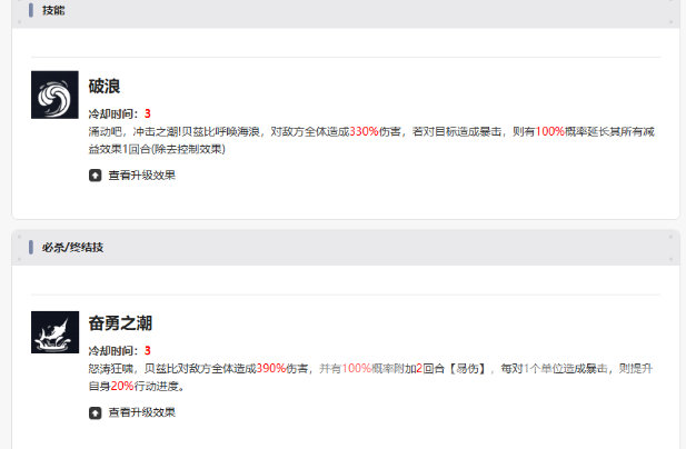 “破浪”是一项冷却时间为三回合的群体攻击技能,释放后召唤海浪对多个敌人造成330%的伤害。关键在于,只要发生暴击,即可将目标身上所有减益状态延长一回合,便于团队持续施压。“奋勇之潮”作为终结技,同样拥有三回合冷却,是其核心爆发手段。该技能可对全体敌人造成390%的高额伤害,并有100%概率附加易伤状态,大幅提升队友后续输出效率。更值得一提的是,每次成功暴击一个单位,自身行动速度将提升20%。若实现全员暴击,则可提前半轮行动,真正体现越战越勇的战斗风格。