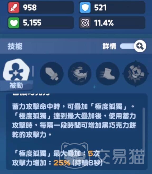 黑巧克力饼干的核心被动“极度孤独”依赖蓄力攻击命中敌人来叠加层数,每命中一次积累一层,叠满五层后可在8秒内获得攻击力翻倍效果。但这一增益需持续通过蓄力维持层数,因此对操作节奏要求较高。普通攻击无额外倍率加成,而蓄力攻击拥有1.2倍基础伤害,并可触发被动叠加。值得注意的是,在蓄力条即将读满时手动释放,比等待自动释放快出约零点几秒,这一细微优势可用于抢占先机,在BOSS出手前完成首击,实现叠层与规避技能双重目的。其小技能黑暗剑击基础伤害达7.5倍,被动叠满后提升至14倍以上;必杀技黑暗袭击可造成20倍以上的高额伤害,冷却时间为30秒,且满星状态下具备50%防御穿透能力。此外,黑暗剑击附带的闪电伤害能够激活后悔卡的暴伤加成,建议在释放小招后衔接普攻再进入蓄力,最大化利用增益时间窗口。