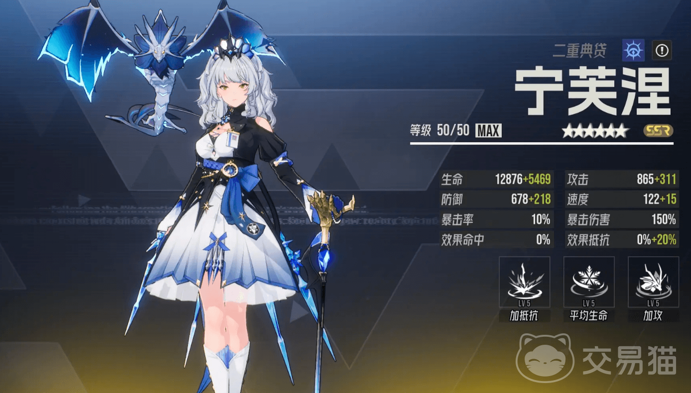 宁芙涅兼具增伤与防护能力,是团队增益体系中的重要一环。“冻凝华”可凝聚寒霜对单个敌人造成240%伤害,并有50%概率为自己添加2回合抵抗提升效果。“溢流霜”则会平均全队成员的生命百分比,并对其进行治疗。终结技为全体友军提供2回合攻击力提升和1回合免疫效果,同时赋予“霜花护盾”,持续2回合;主目标所获得的上述增益效果将持续3回合。