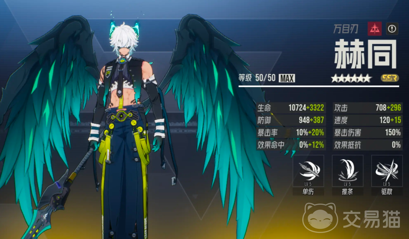 被动技能使其在战斗开始时获得500点防御,并提升12%反击率和6%伤害。“必杀技”对所有敌人发动两段攻击,每段造成180%防御力伤害,每次攻击有50%概率驱散一个增益状态,并附加2回合攻击力与抵抗下降的负面效果。