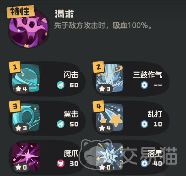 其核心特性为“渴求”,当叮叮恶魔在回合内先手发动攻击时,可获得等同于伤害量100%的吸血效果。结合其高物攻属性,这一机制能在实战中实现显著的续航能力,甚至在残血状态下完成反杀,具备改变战局的能力。