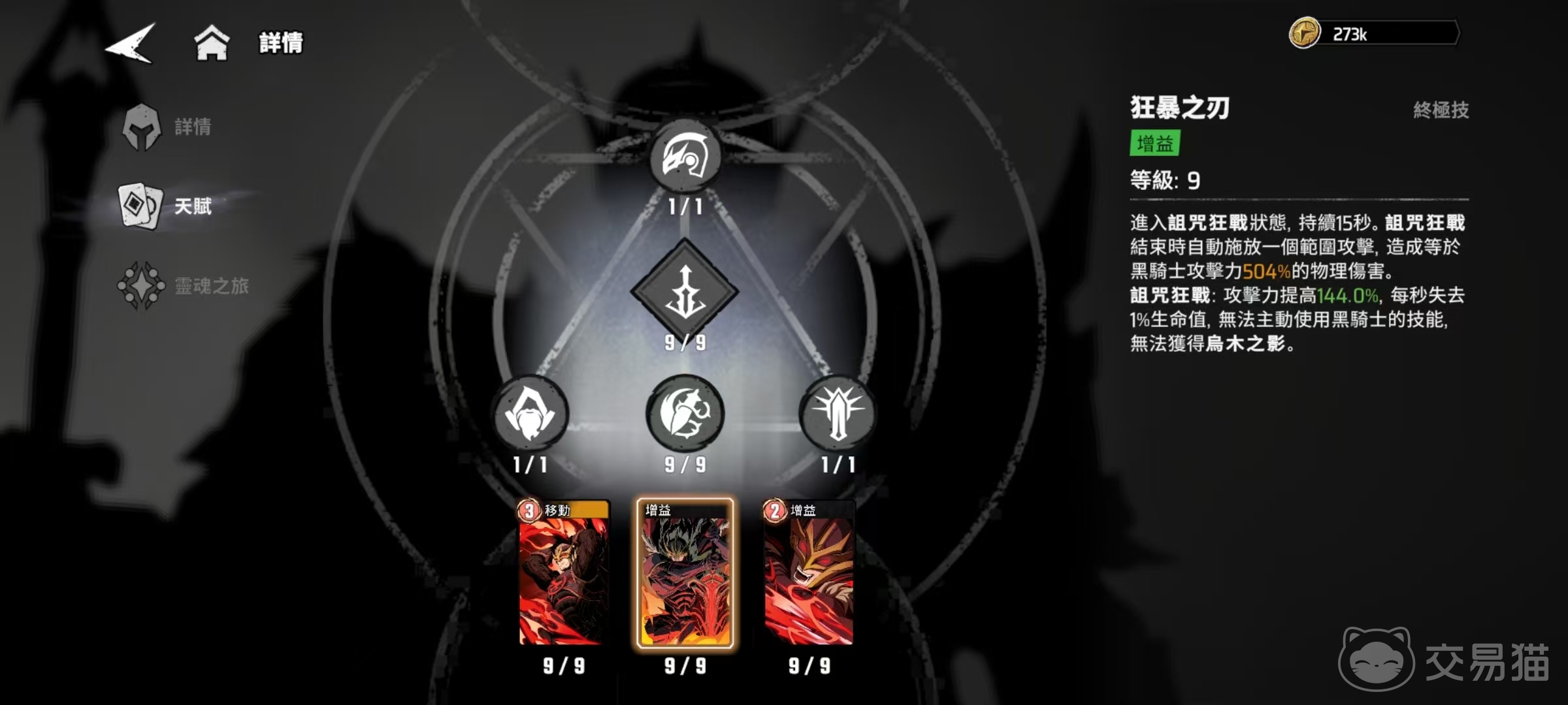 终结技狂暴之刃开启后,黑骑士进入持续15秒的诅咒狂战状态。在此期间攻击力显著提升,但会持续损失生命值,且无法主动使用其他技能或获取乌木之影。状态结束时将自动释放一次范围性物理攻击。若搭配灵魂之旅的强化效果,则在狂战状态下免疫死亡,即使血量降至1点也不会倒下,并可继续积累乌木之影,大幅优化输出节奏与生存稳定性。