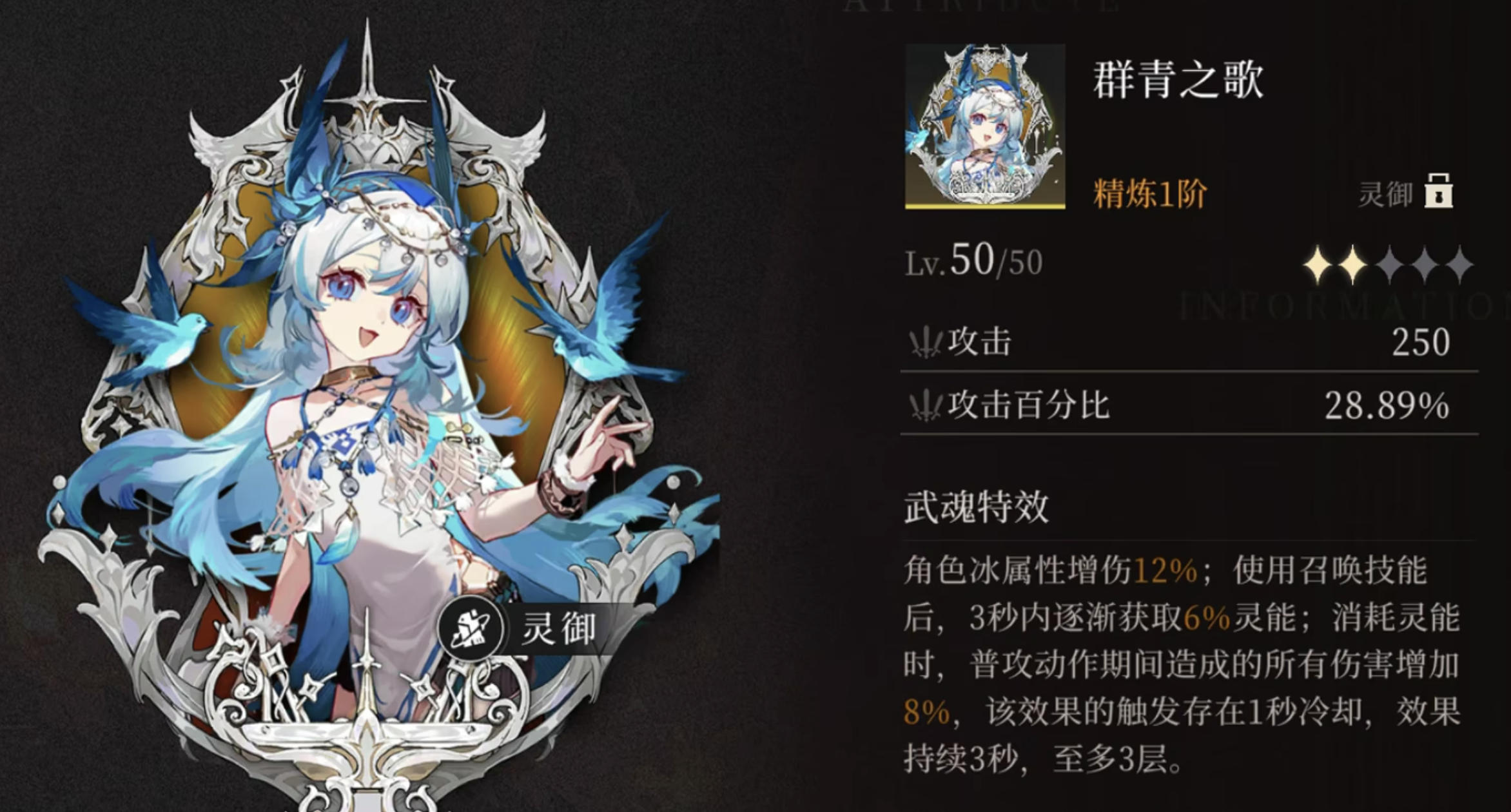 伊莱莎拥有专属武魂“群青之歌”,该武魂虽仅提升普攻期间的伤害,看似普通,但由于伊莱莎能同时操控自身与龙协同攻击,这一加成会同时作用于双单位,从而实现整体输出的大幅提升。