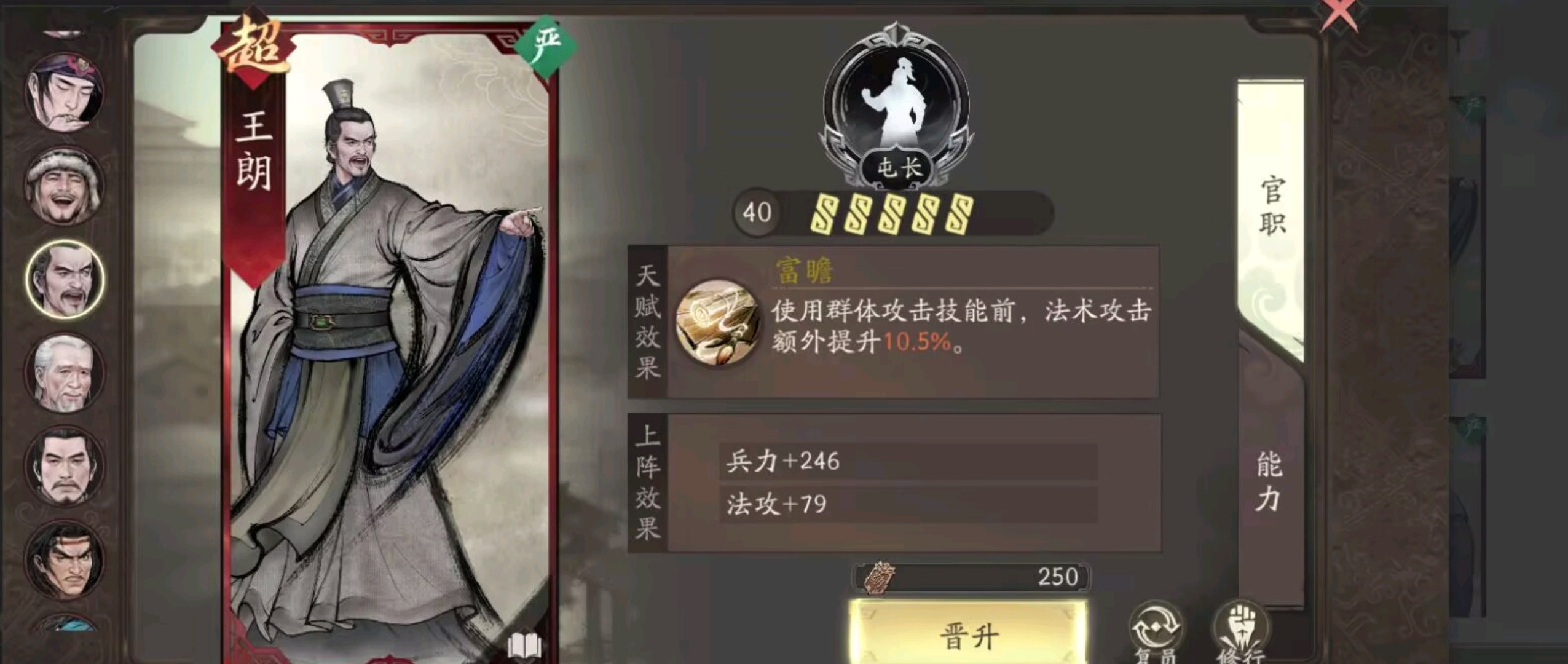 随着游戏进程推进,后期可替换为卞氏或王朗。其中王朗的技能“富瞻”在释放群体法术攻击前,可提升自身10.5%法术攻击力,适合缺乏法系输出的阵容选用。总体而言,貂蝉适配性极高,几乎兼容各类主C组合。