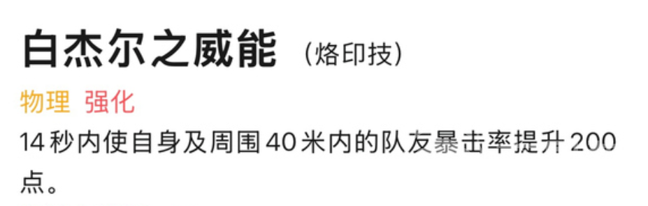白杰尔之威能是一项团队增益型物理技能,使用后可在14秒内提升自身及周围40米内最多4名队友200点暴击率,极大增强队伍的整体输出能力,适合在团战前释放以形成爆发优势。