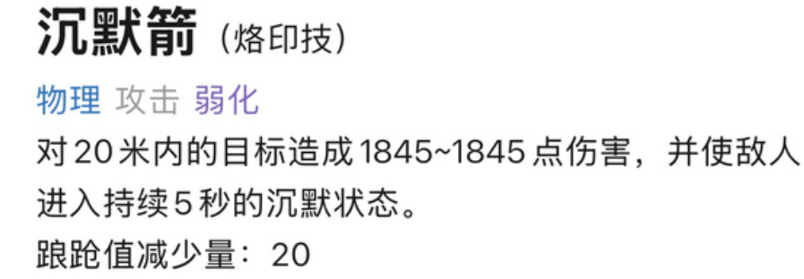 沉默箭针对20米内的单一目标发动强力打击,造成1845点物理伤害,并使其进入持续5秒的沉默状态,无法释放技能,同时减少20点踉跄值。此技能在对抗依赖技能输出的敌人时具有极强的限制作用。