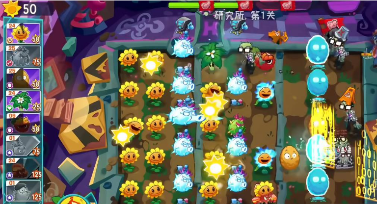 电系搭配以脉冲黄桃、松针射手和电能坚果为核心。脉冲黄桃可进化其他电系植物,强化其性能表现;松针射手拥有强力单排清怪能力,配合电能坚果的无限复生特性——即使被僵尸吞噬也能迅速重生——形成稳定输出链。当这些植物串联激活时,发射的弹道会分裂并附带麻痹效果,显著减缓僵尸移动速度,实现有效控制。