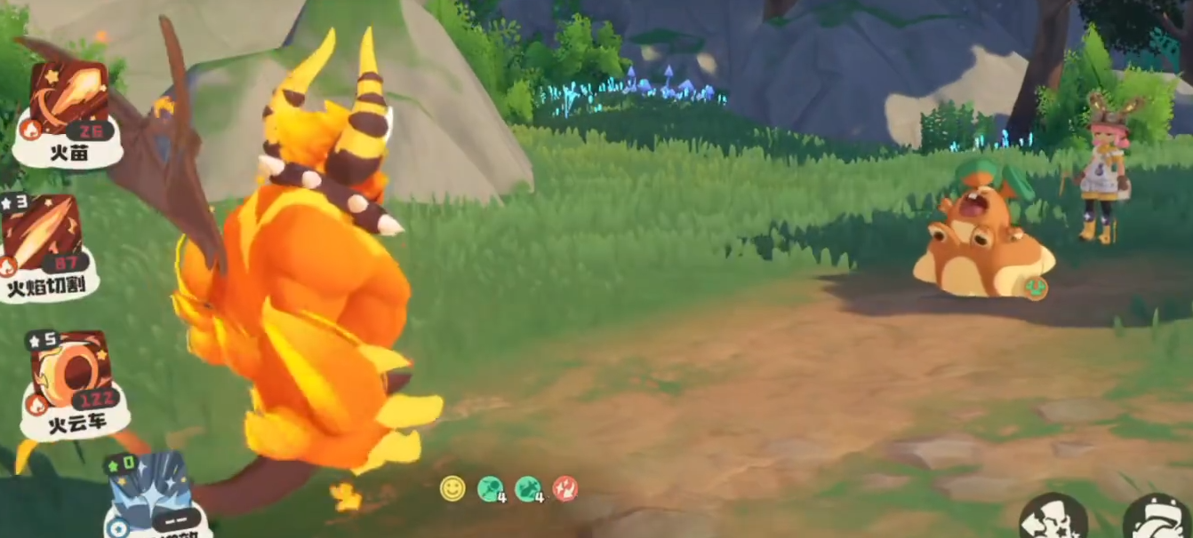 接下来出场的是普系精灵蹦床松鼠,其拥有“囤积”特性,且火系技能会被其土属性克制。此时应切换至瞌睡王出战,凭借较高的物攻能力,使用二星技能“斩断”配合“崩拳”即可高效解决目标。第三位对手为萌+草系的蒲公英娃娃,此时重新换上火神精灵,利用火系对草系的属性优势进行压制。