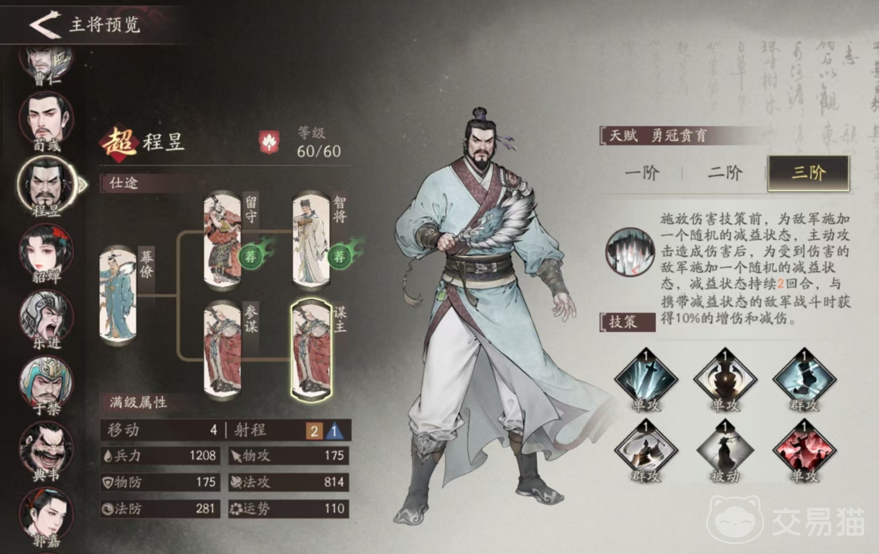 除了郭嘉之外,程昱也是与戏志才搭配效果出色的主将之一。程昱的技能机制以附加随机减益状态为核心,使用主动技能前还可额外叠加一层负面效果,并对已负伤单位实现增伤与反减伤。在戏志才的加持下,程昱的输出效率和战场存活率均得到进一步强化。其他如简雍、荀攸等谋士类主将,虽非最优组合,但仍能从戏志才的属性增益中获益明显。