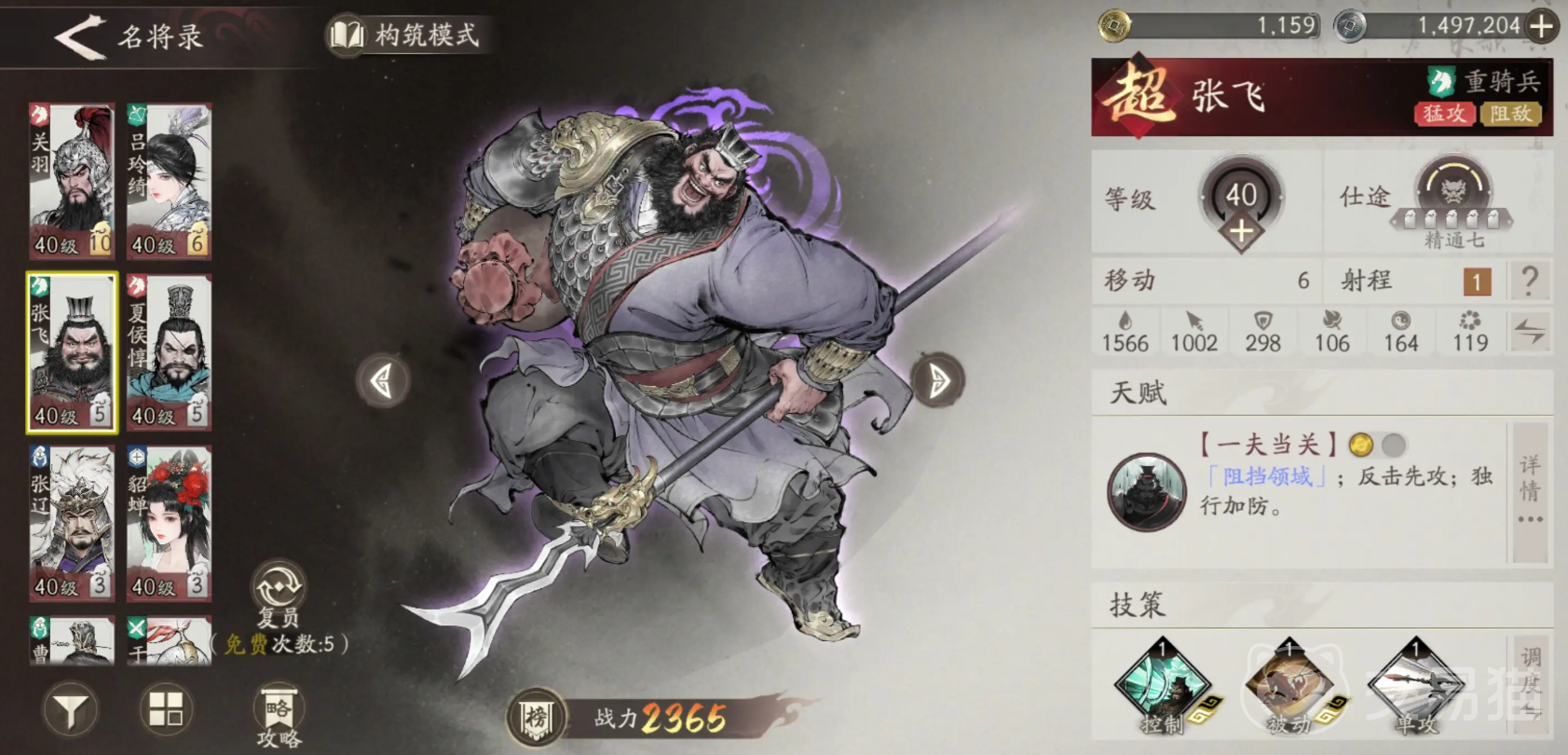 张飞的作战风格为“严”,可选择骑兵或长兵进行战斗。其天赋可在前方直线两格范围内生成阻挡领域,使十字方向两格内的位置无法通行,形成有效的地形封锁。当自身兵力高于50%时,受到攻击触发反击将获得先攻效果,且反击伤害提升75%,大幅增强生存与反打能力。