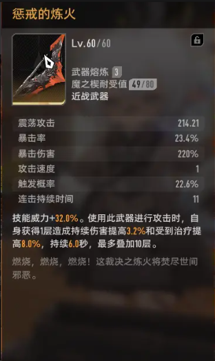 此外,惩戒的炼火也是不少玩家青睐的替代方案。该武器可通过副本掉落材料自行锻造,获取途径稳定且门槛较低。与春玦戟相比,其优势在于能显著增强基础面板属性。被动技能可提供20%至40%的威力加成,非常适合前期堆叠战斗力。需要注意的是,该加成仅作用于自身,并不能共享给其他武器。不过鉴于近战武器在当前测试版本中多用于过渡用途,这一限制影响较小,待获取毕业装备后更换即可。