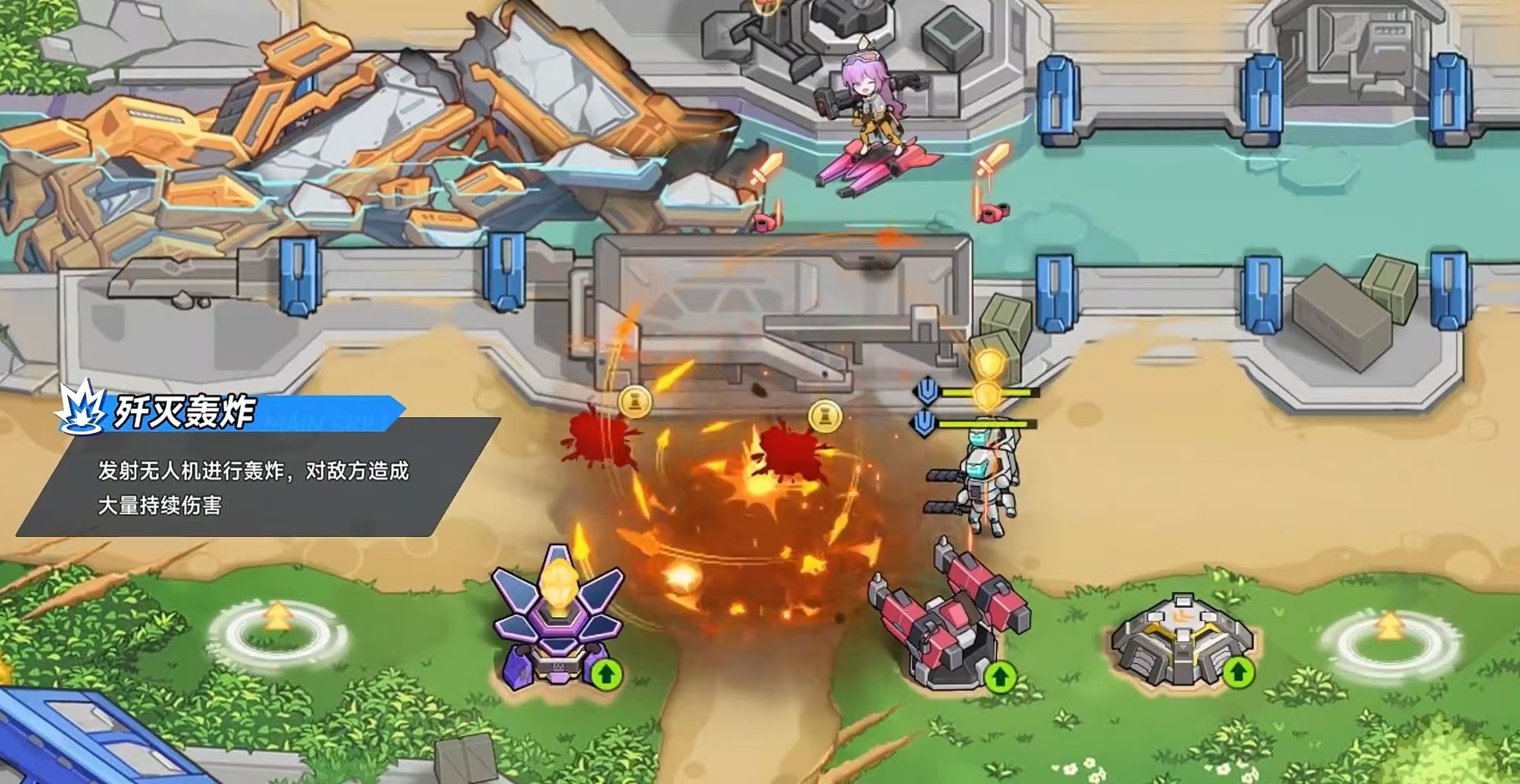 伊莉丝的核心特质为高原增幅,具备滑翔机动性,定位偏向于灵活作战单位。她的第一个主动技能“歼灭轰炸”能够释放无人机对敌方区域进行持续打击,虽然单次伤害并不突出,但累积的范围持续伤害极为可观,在长时间交战中表现出色。第二个技能“蜘蛛E30”则具备周期性召唤功能,可部署自动攻击的机器人单位,这些机器人会锁定周围敌人进行远程输出,有效提升整体火力覆盖范围。