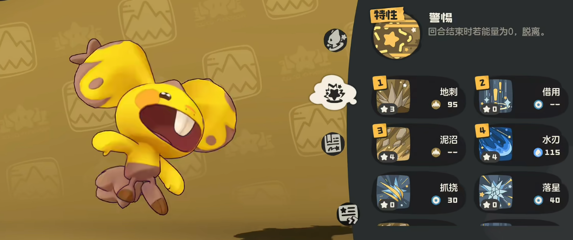 其核心特性为“警惕”,即当回合结束时若能量归零,则会自动脱离战斗。基于此机制,推荐配置以下技能组合:地刺、借用、泥沼与水刃。其中地刺为3星技能,威力95,属于物理单体攻击,具备打断效果,能有效干扰对手节奏。