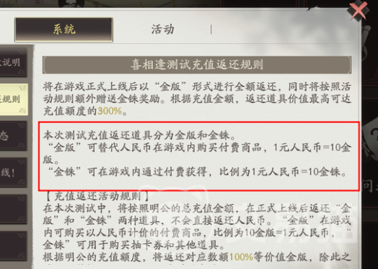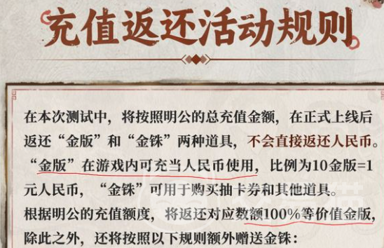 需要明确的是,此次返还并非直接退还人民币,而是以两种游戏内道具形式进行返还:金版与金铢。其中,1元人民币对应10个金版,同时也等于10个金铢。金版在正式服上线后具备等同于人民币的实际价值,可用于购买月卡、礼包或其他标有人民币价格的商品,相当于实现本金全额返还。而金铢则主要用于兑换抽卡券或特定游戏资源,帮助玩家积累抽卡所需材料。
