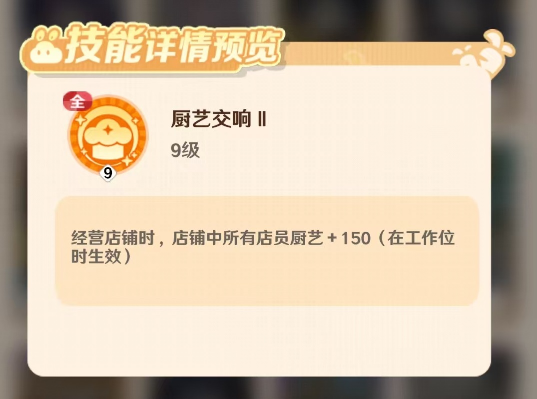 第二个单体技能则与店铺客流状态相关——当店内入座率达到较高水平时,皮皮将获得移动速度与工作效率的提升,但该技能设有较长的冷却时间,需合理规划使用时机。至于两个全体技能,分别能为所有在岗店员提供基于百分比的厨艺加成以及固定数值的额外提升,双重效果叠加后显著增强整体厨房运作效率。