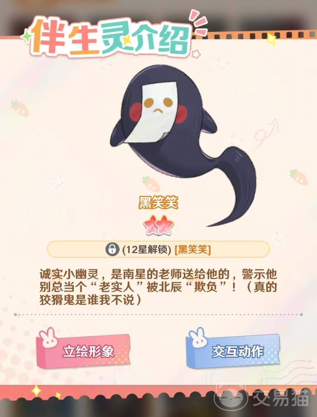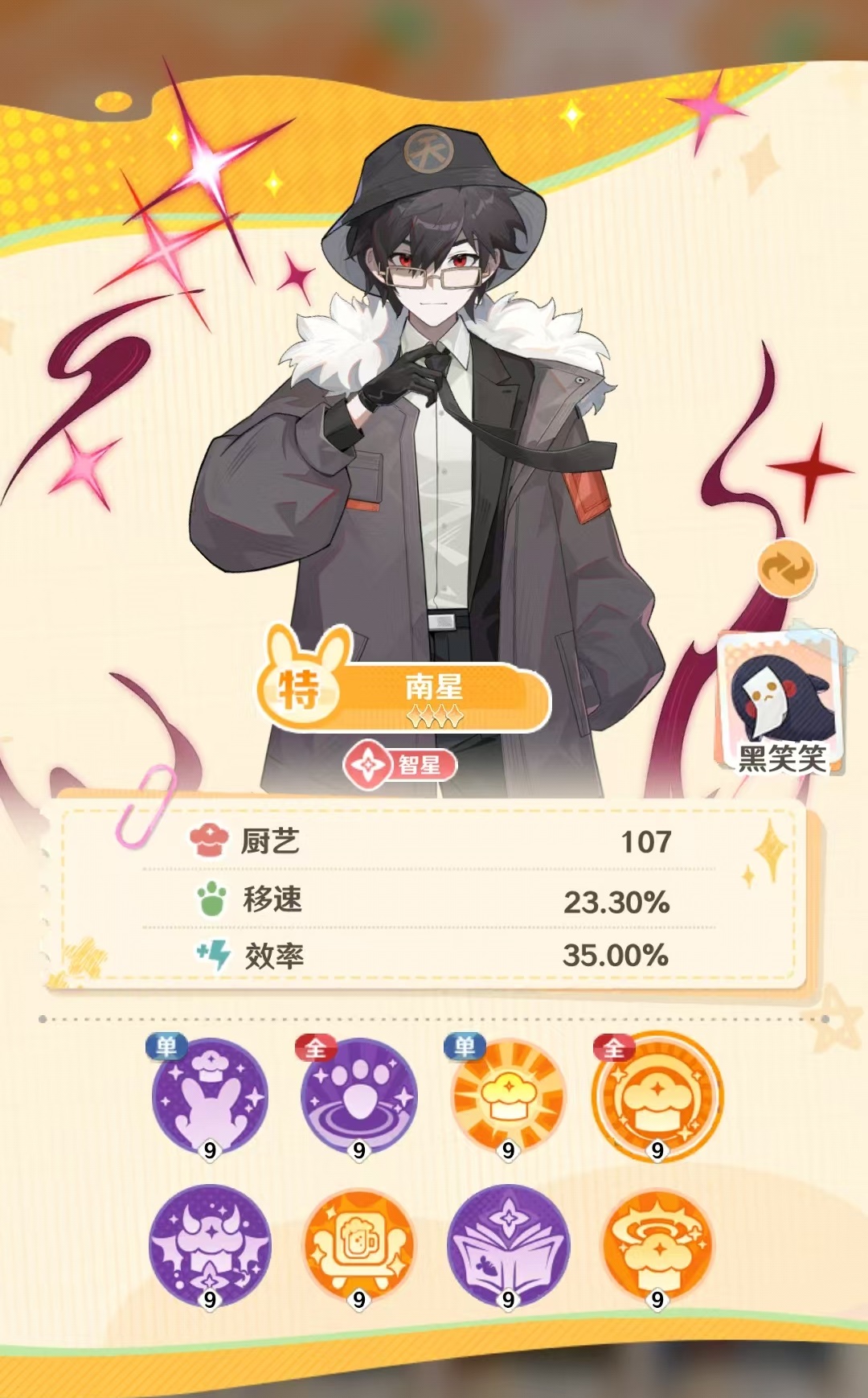南星的伴生灵名为黑笑笑,当南星升至12星后即可解锁这一特殊伙伴。这个诚实又可爱的幽灵不仅是南星的忠实陪伴者,还能化身为一台照相机,在日常互动中增添不少趣味。在技能配置方面,南星的第一项能力为“厨力全开”,效果是在店铺制餐期间提升自身13%的厨艺值,只要处于工作状态即可持续生效。