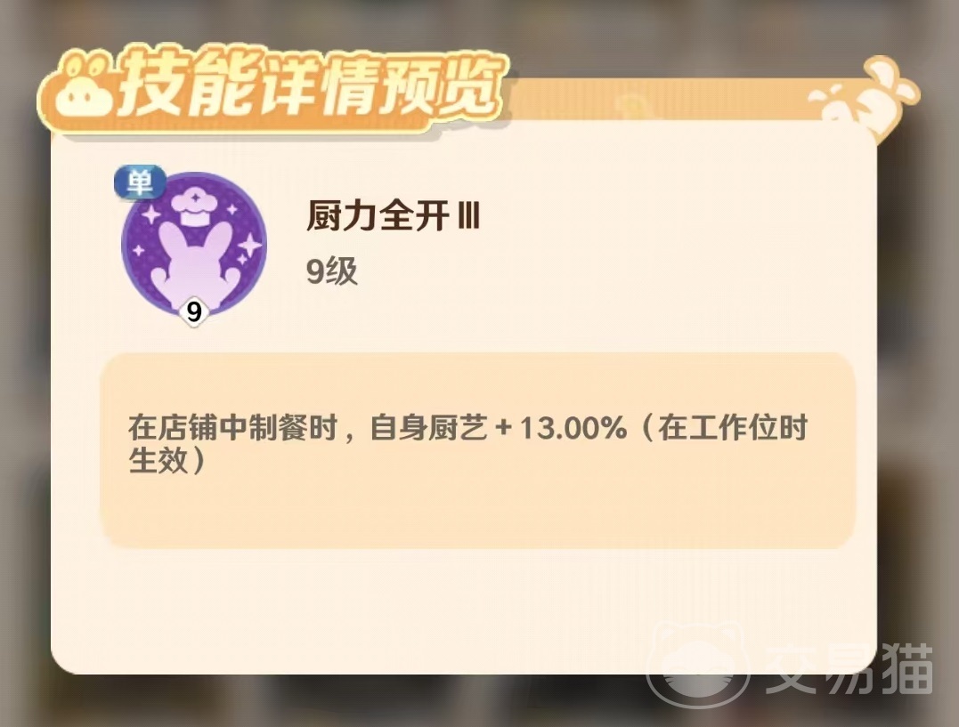 第四项技能“厨艺交响”为团队增益类技能,可在经营过程中为店内所有店员提供150点厨艺加成。此外,他还拥有多项协同效应,例如在参与超级厨王秀活动时,所有具备“智星”特质的店员厨艺会大幅上升;完成商务聚会任务后,持有“智星”标签的角色还将获得额外厨艺成长,并提升商铺经验获取效率。
