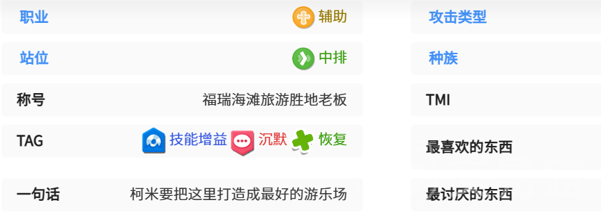 综合来看,嘟嘟脸恶作剧科米是一位集治疗、增伤、控制与减伤于一体的全能型辅助角色。其技能组全面且实用,培养性价比高。若希望提升队伍整体持续作战能力,建议将其安排在中排,配合主力输出角色共同出战,从而有效提升团队整体战斗力。