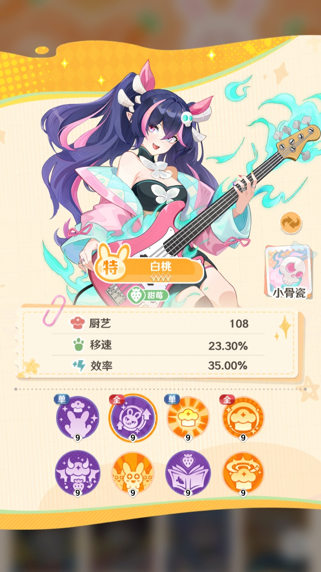 该阵容的核心输出点在于收益构建体系,其中白桃扮演着至关重要的角色。她的被动技能可使所有菜品售价提升+28,尽管单看数值并不突出,但在持续积累下能显著拉高整体收入水平。配合小珊沫的客流量+13%加成,二者共同形成“高单价+多顾客”的良性循环,极大增强店铺在高峰期的承载能力和盈利能力。
