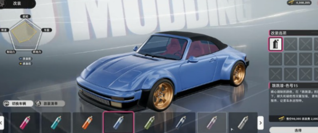 外观定制是多数玩家关注的重点之一。4S店内提供了丰富的车身颜色选项,包括经典的黑色、活泼的粉色以及极具科技感的金属渐变色。玩家既可以为整车重新喷漆,也可以仅对局部区域进行色彩调整,实现更精细的设计效果。此外,涂鸦系统也十分完善,允许玩家在车门或其他部位添加个性化图案,例如卡通形象或专属标志,从而提升整体视觉辨识度。