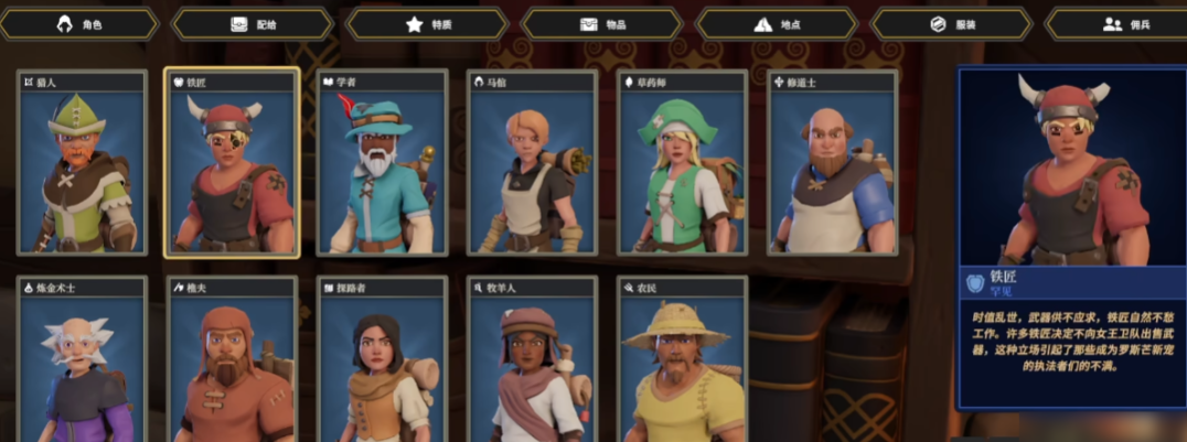 铁匠作为力量型代表,基础属性全面且突出,尤其在耐久与近战攻击方面具备显著优势。可装备单手锤或盾牌进行持续输出与防御兼顾的操作,战场适应性强。虽然在主动技能释放上略有局限,但凭借稳定的生存能力和可观的物理伤害,依然是团队中不可或缺的前排担当。