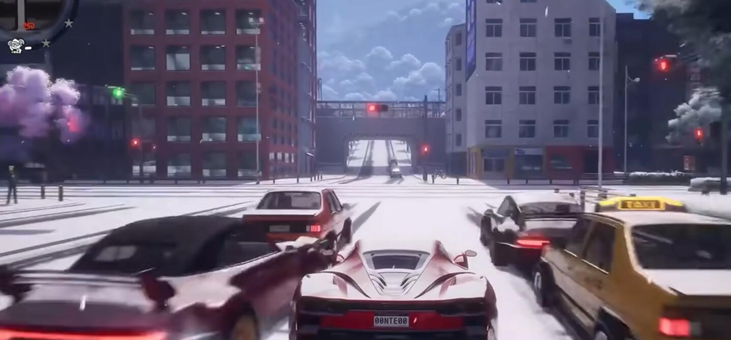 在雪天环境中,最直观的感受来自车辆与场景表面的积雪变化。车顶积雪会从零星分布逐渐累积成厚重复盖层,通过触控还能观察到积雪滑落的物理反馈。行驶轨迹留下的车辙与角色行走产生的脚印均非静态贴图,而是依托新型特效叠加系统与粒子引擎生成的立体痕迹,踩踏后甚至呈现细微凹陷效果。不过当前脚印仍以长条形态呈现,与真实足印存在一定差异,推测为性能优化所限。此外,所有地面痕迹保留时间约为30秒,随后将被新落下的雪花覆盖。