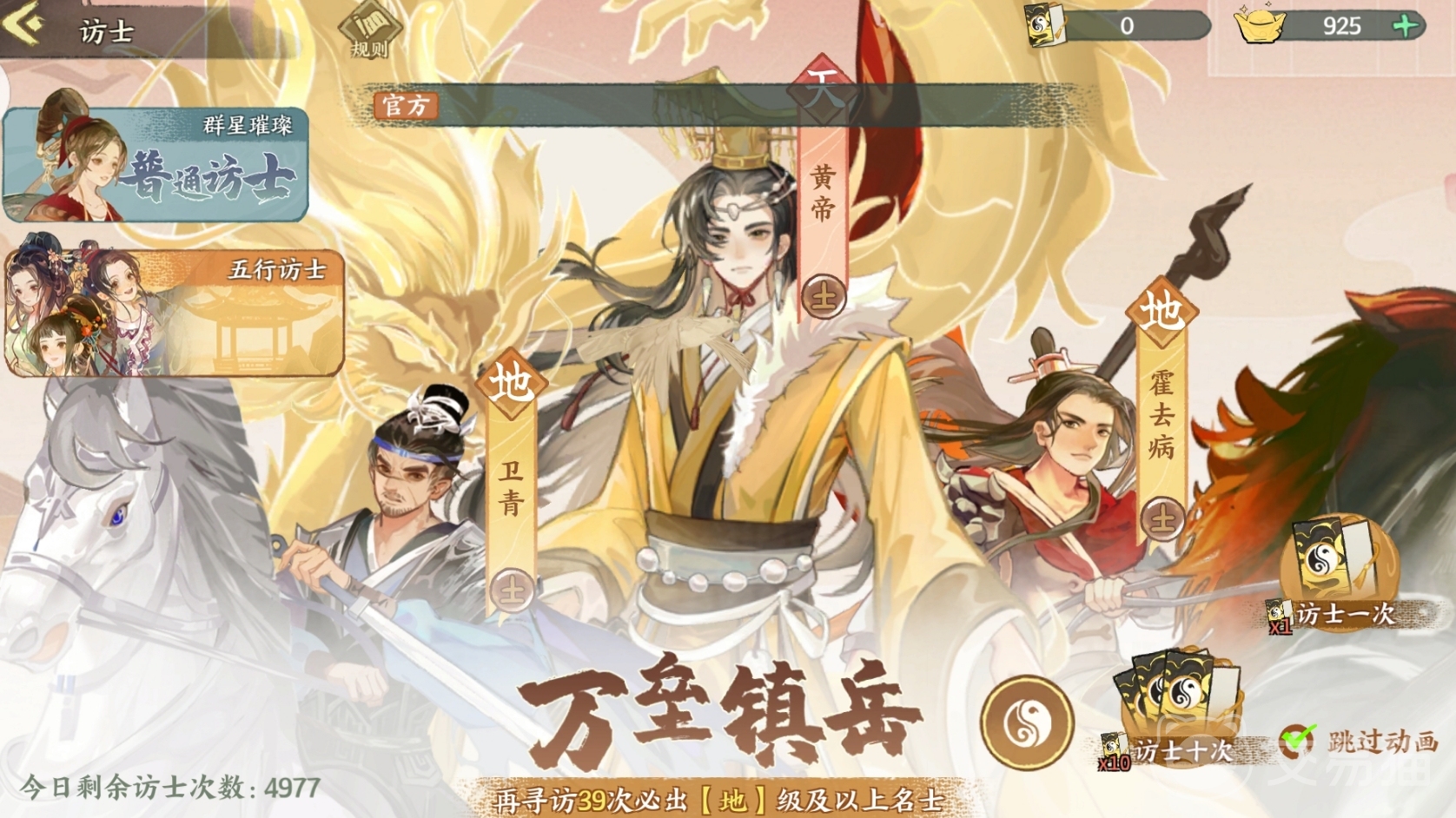 五行访士则提供了更具针对性的抽取体验。在进行抽取前,玩家需先选定金、木、水、火、土五种属性之一,后续所有抽出的名士均属于该属性范围,便于集中培养特定属性队伍。同样拥有40抽保底获取地级名士的设定,且有机会随机抽取到对应属性的天级名士,但天级名士无保底规则,全凭运气。该卡池使用的抽取材料为五行拜贴,可通过周常任务、征战副本等玩法获取,也可通过购买限时礼包获得。若后期调整培养方向,还可随时更改已选择的属性,灵活性较高。