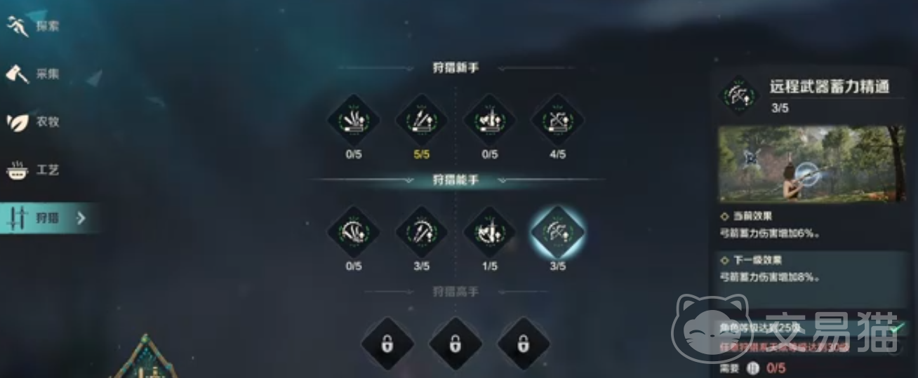 除了加点策略外,天赋升级机制也值得了解。游戏中各个天赋板块包含多个技能节点,想要提升其等级,关键在于积累熟练度。通过频繁使用对应功能(如持续狩猎、反复采集等),即可获得相应经验。当经验条满后,该天赋自动升级,解锁更强效果。
