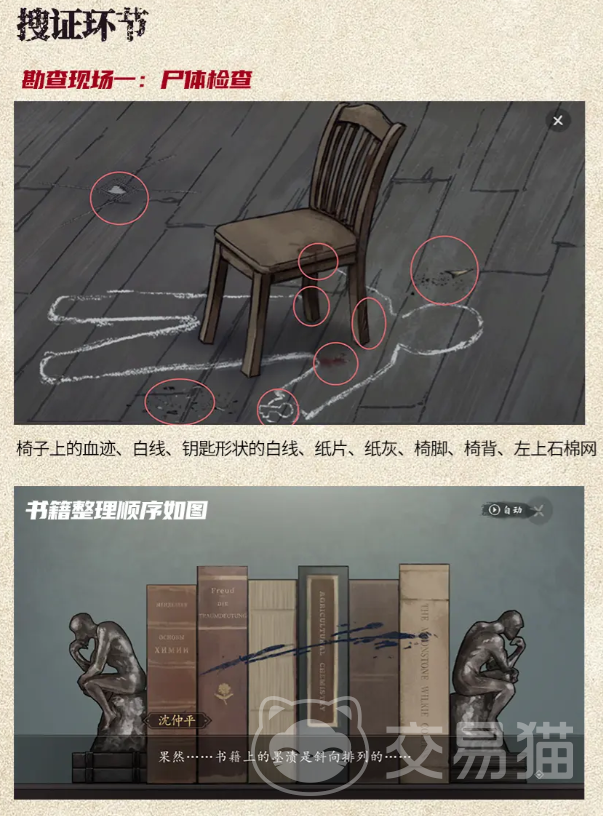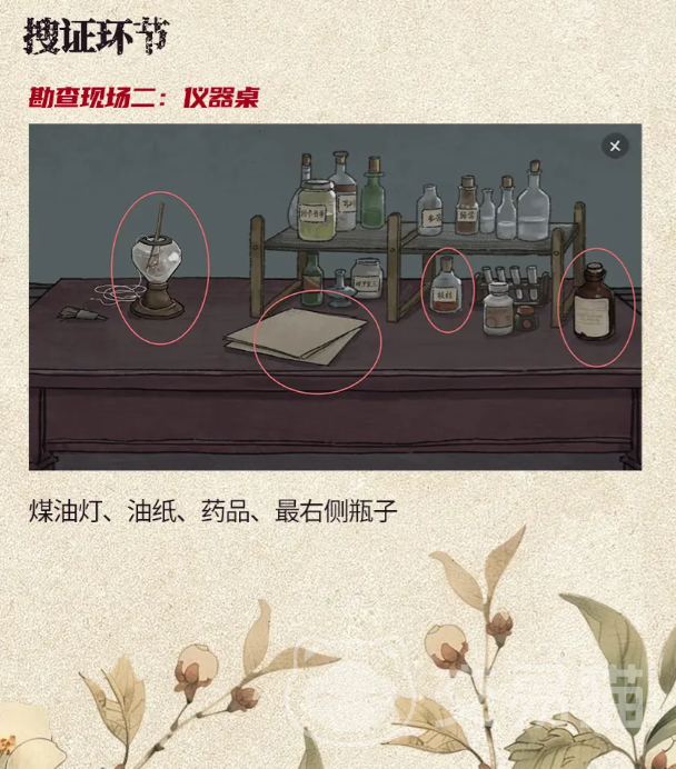该章节的核心机制围绕线索搜集与逻辑串联展开。首要调查地点为案发现场的密室,进入房间后应有条不紊地进行勘察。首先关注地面的人形标记周围是否有异常痕迹,接着查看房间左上角的石棉网状态,虽看似普通但可能隐含重要信息。随后对室内固定设施逐一排查:实验台上的煤油灯残留情况、油纸是否存在破损、药瓶排列顺序是否紊乱,尤其是最右侧药瓶的标签内容及其内部物质状态,均需仔细记录。