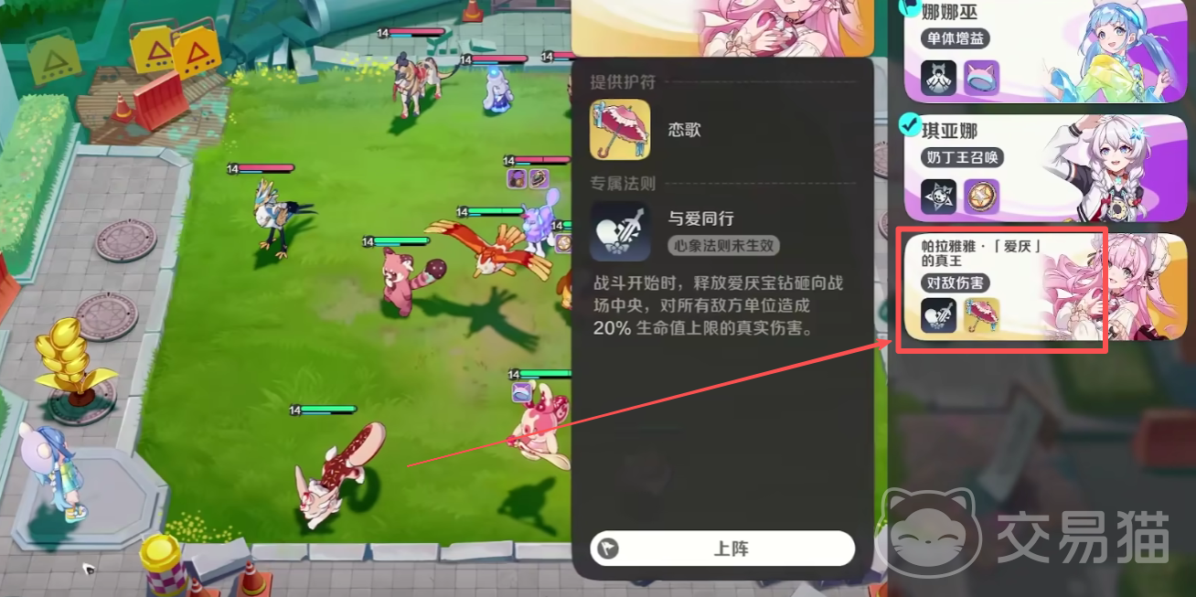 关于装备搭配,推荐选择帕帕雅雅作为佩缨章鱼的武器配置。该单位拥有恋歌护符以及专属法则“与爱同行”,在战斗开始时可投掷特殊宝钻至敌方区域中心,对全体敌人造成相当于其生命上限20%的真实伤害,具备出色的开局压制力。