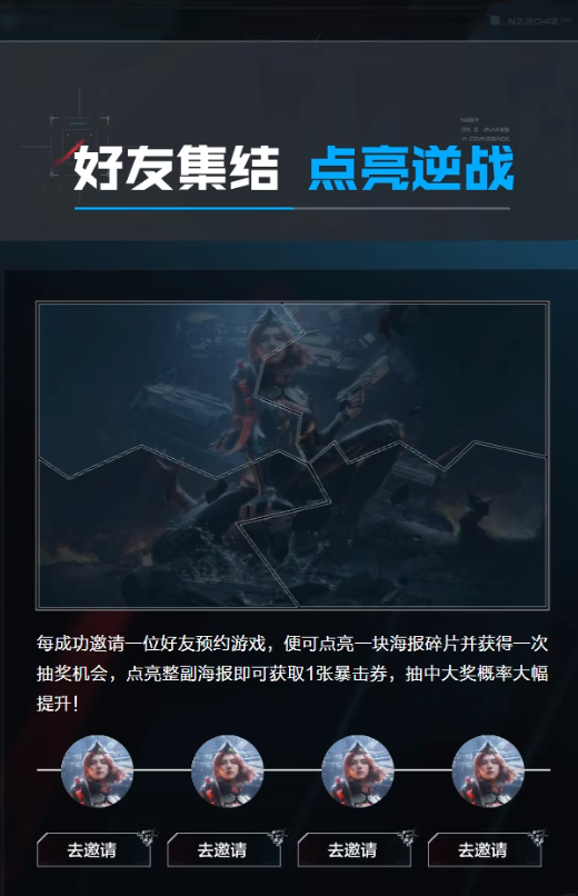 以上就是关于《逆战:未来》预约奖励的完整说明。除了基础奖励外,邀请好友一同参与预约还可额外获得角色皮肤及高级补给包。建议召集热爱枪战题材的玩家朋友共同预约,待正式上线后即可组队出击,体验多样化的战斗乐趣。