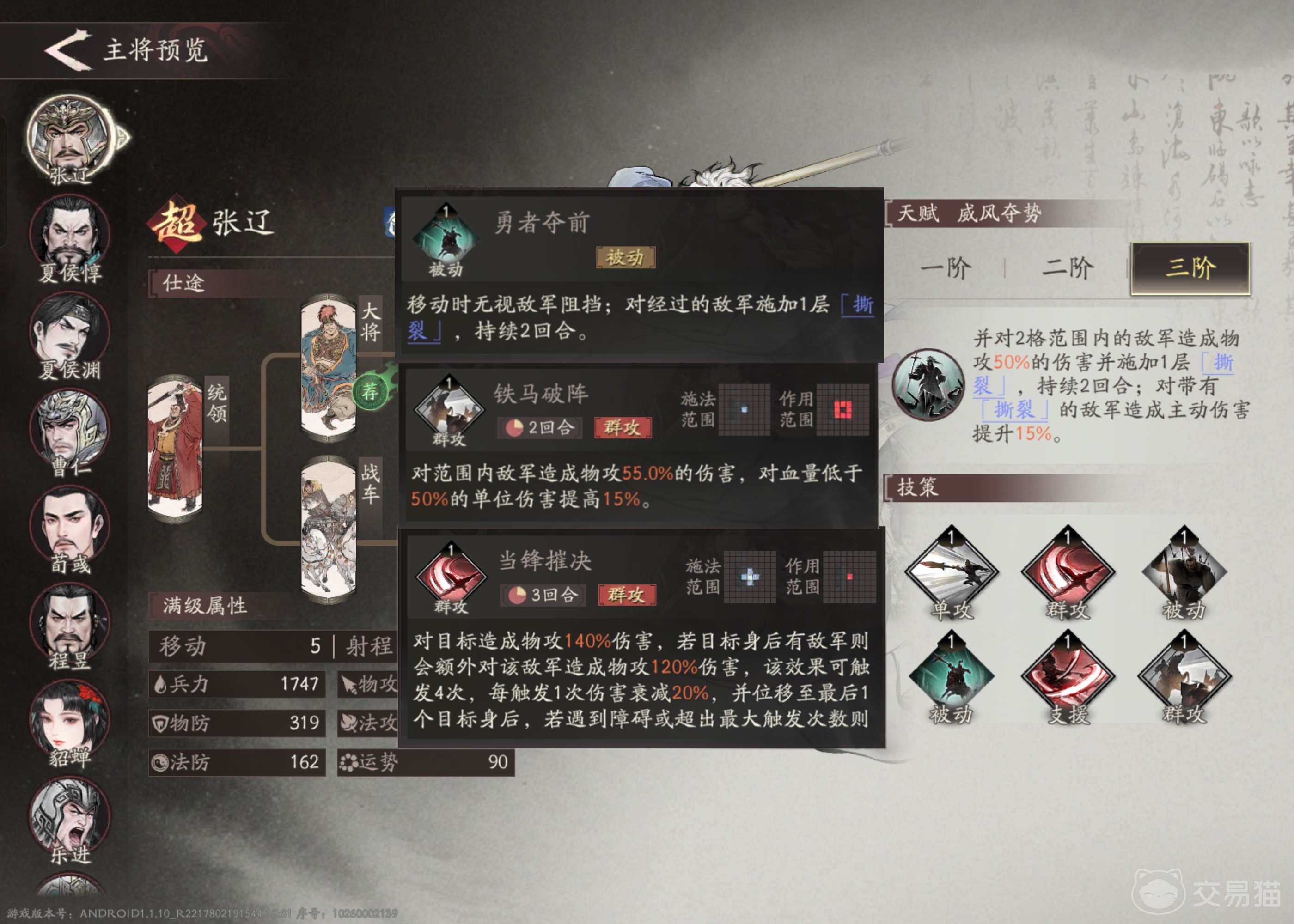 实战中,小编推荐搭配貂蝉(提供再动效果)与陈到(附加撕裂状态)作为核心辅助,进一步强化张辽的输出节奏。同时加入徐晃和郭嘉两名控制型武将,既能限制敌方关键单位行动,又能保障己方阵型稳定。这套组合攻守均衡,能最大化激发张辽的作战潜能,值得尝试。
