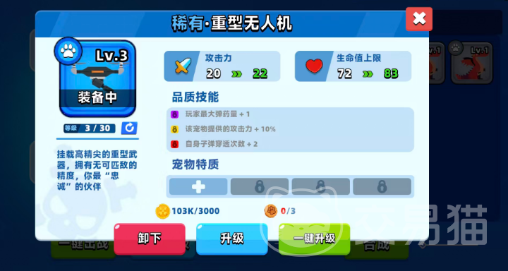 重型无人机是机械系流派的核心宠物之一,能够为角色提供最大弹药量+1的增益,显著减少换弹频率。该宠物自身也享有10%的攻击力提升,而在升到顶级品质后,其发射的子弹还将额外获得2次穿透能力,极大增强了清怪效率和面对群敌时的持续输出表现,是构建机械流阵容不可或缺的选择。