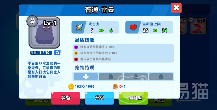 雷云是一款外形如黑灰色云团的宠物,虽然基础攻击偏低,但功能性突出。其技能可加快10%的弹药回复速度,非常适合采用高频射击战术的玩家。此外,雷云自身也能获得10%的攻击力加成,当品质升至最高时,攻击间隔还会进一步缩短。若搭配雷电系技能使用,可大幅提升整体输出频率,形成高效的连击压制效果。